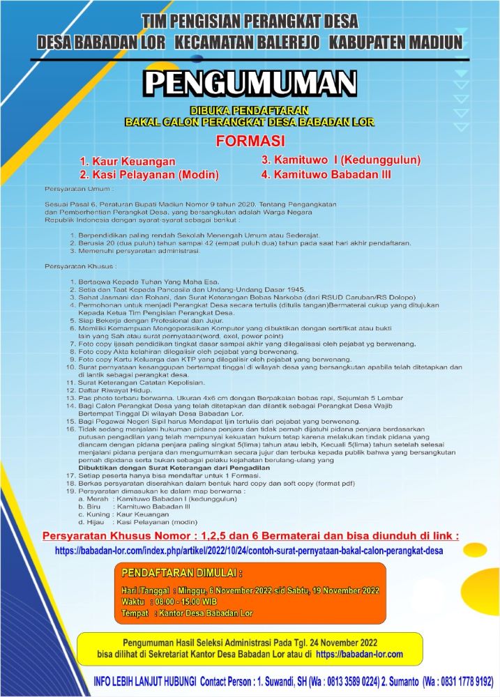 Pengumuman Pendaftaran Perangkat Desa Babadan Lor Tahun 2022
