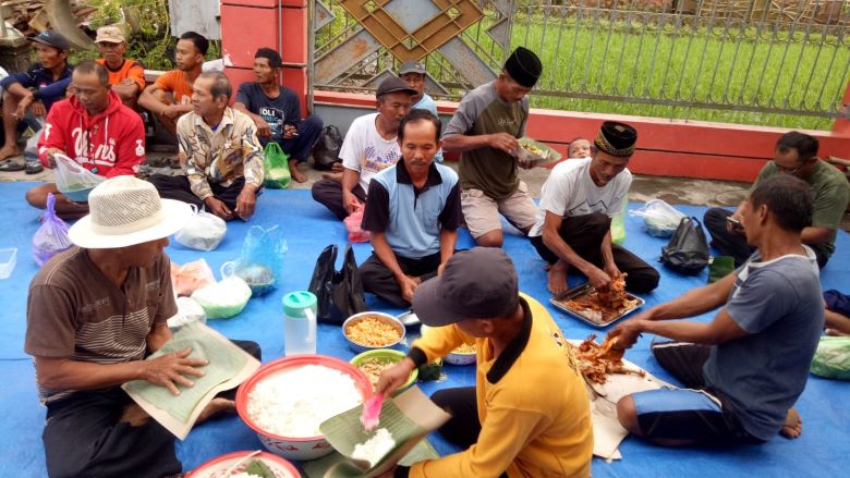 Warga yang hadir sebagian besar diwakili oleh kaum laki-laki dengan membawa makanan berupa tumpeng nasi dan lauk pauk seadanya. Setelah kirim doa, makanan tersebut dibungkus dengan daun pisang dan dibawa pulang masing-masing warga.