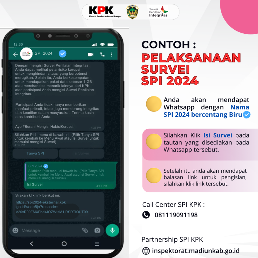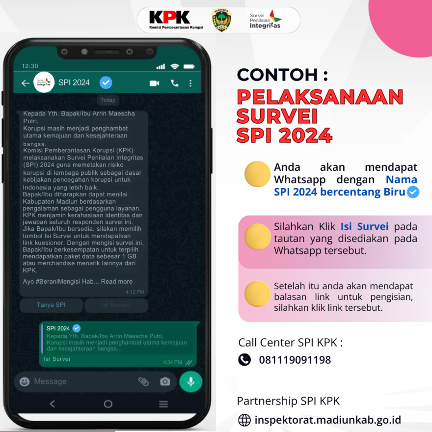 Ayo bersama-sama kita sukseskan SURVEI PENILAIAN INTEGRITAS tahun 2024 dengan berpartisipasi aktif dan memberikan informasi yang akurat, demi memastikan hasil yang optimal dan meningkatkan standar integritas Pemerintahan Kabupaten Madiun.