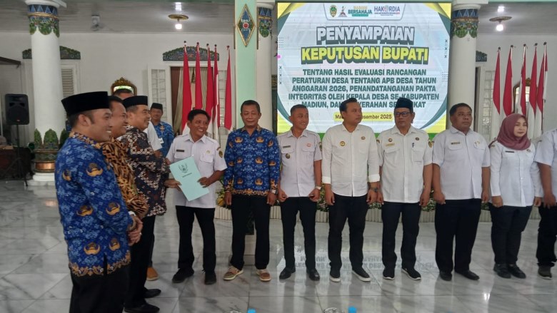 Pemerintah Kabupaten Madiun menyampaikan Keputusan Bupati tentang Hasil Evaluasi Rancangan Peraturan Desa mengenai Anggaran Pendapatan dan Belanja Desa (APBDes) Tahun Anggaran 2026 sekaligus menggelar penandatanganan Pakta Integritas oleh Kepala Desa, Rabu (17/12/2025).